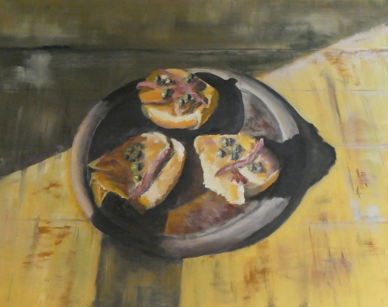 E023 - Broodje zalm, Anjovis en kappertjes (afm. 50x40), olieverf | Te koop